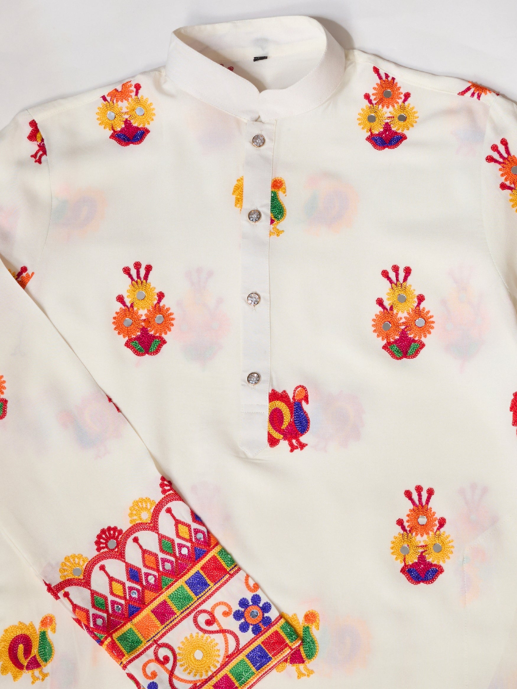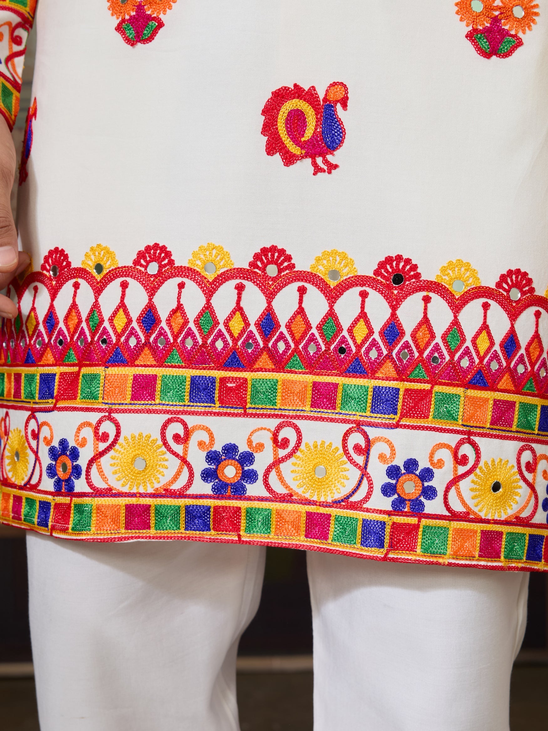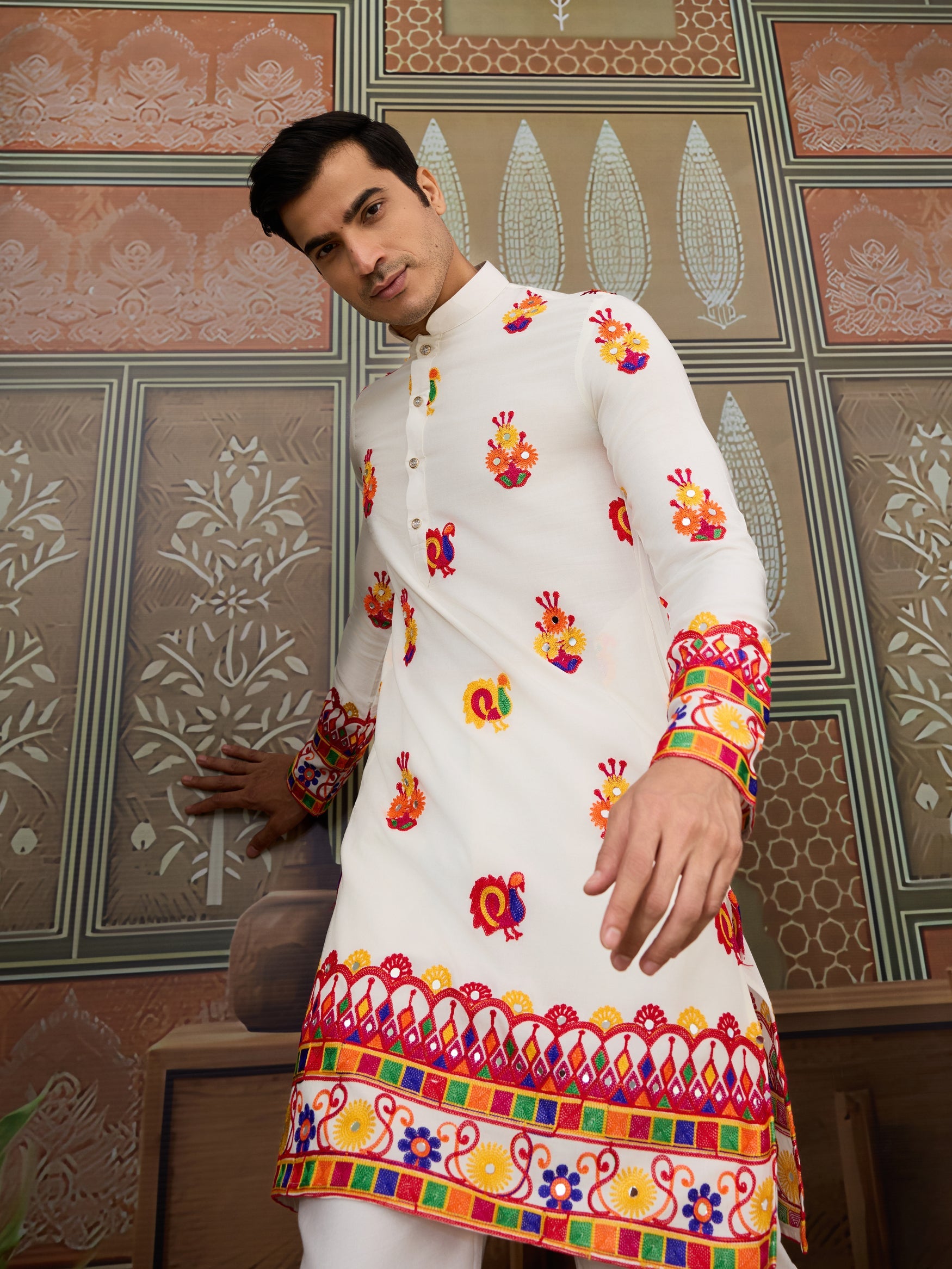 Celebrate the season in style with this white cotton kurta, crafted for ultimate comfort ๐ค and festive charm โจ. Adorned with intricate multi-thread embroidery ๐งต and delicate mirror work ๐ฎ, this kurta blends simplicity with sophistication โ making it a perfect choice for Navratri nights ๐ช๐.
