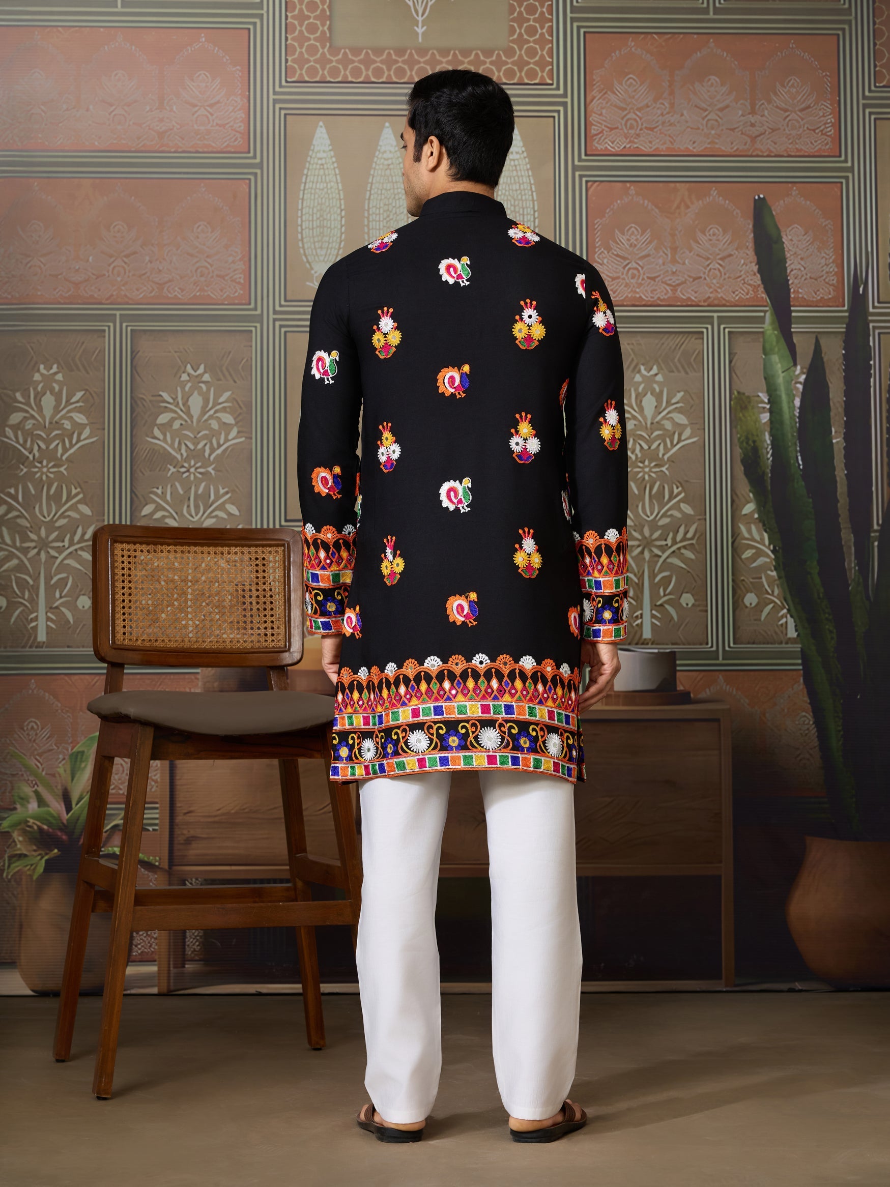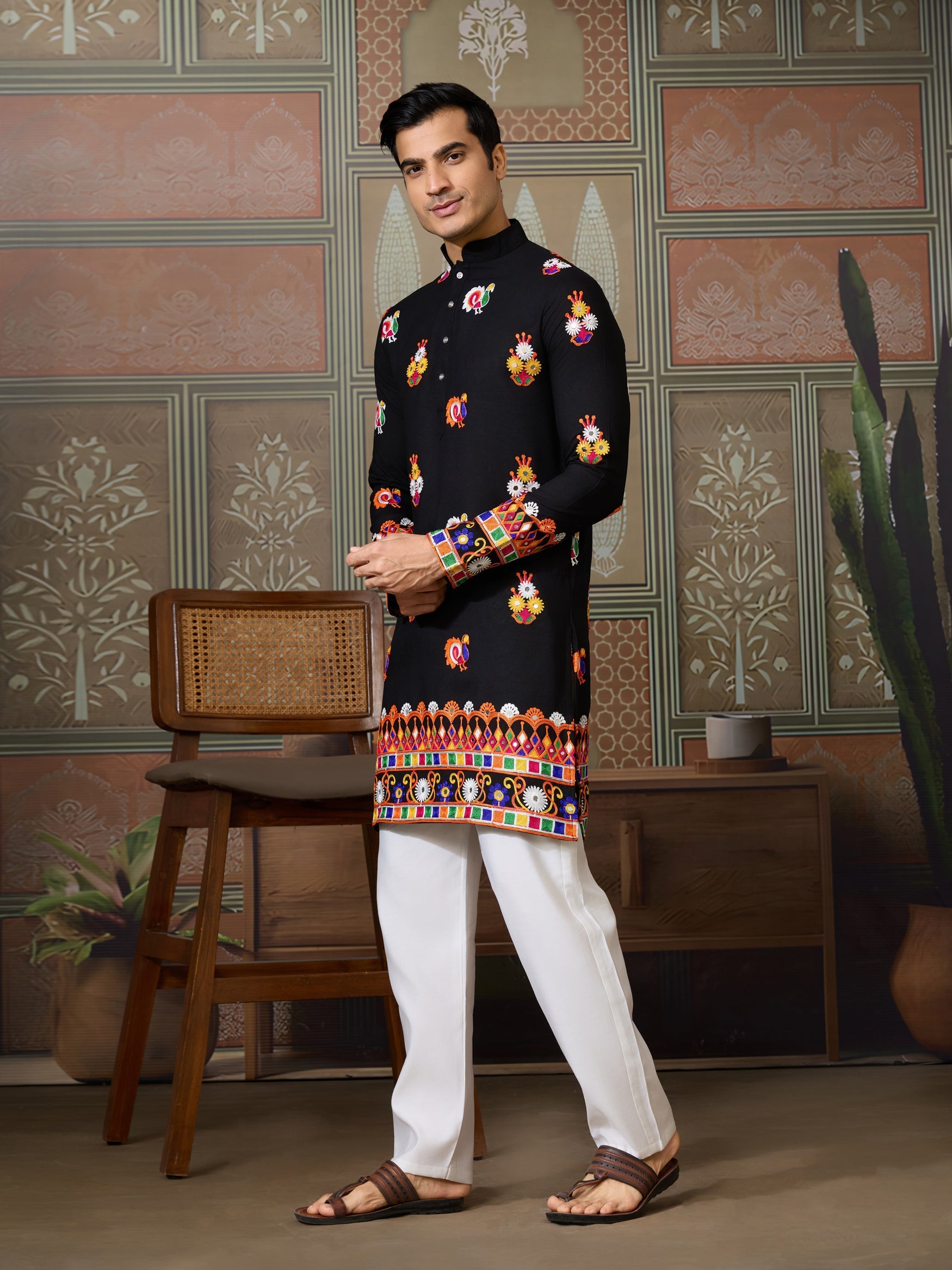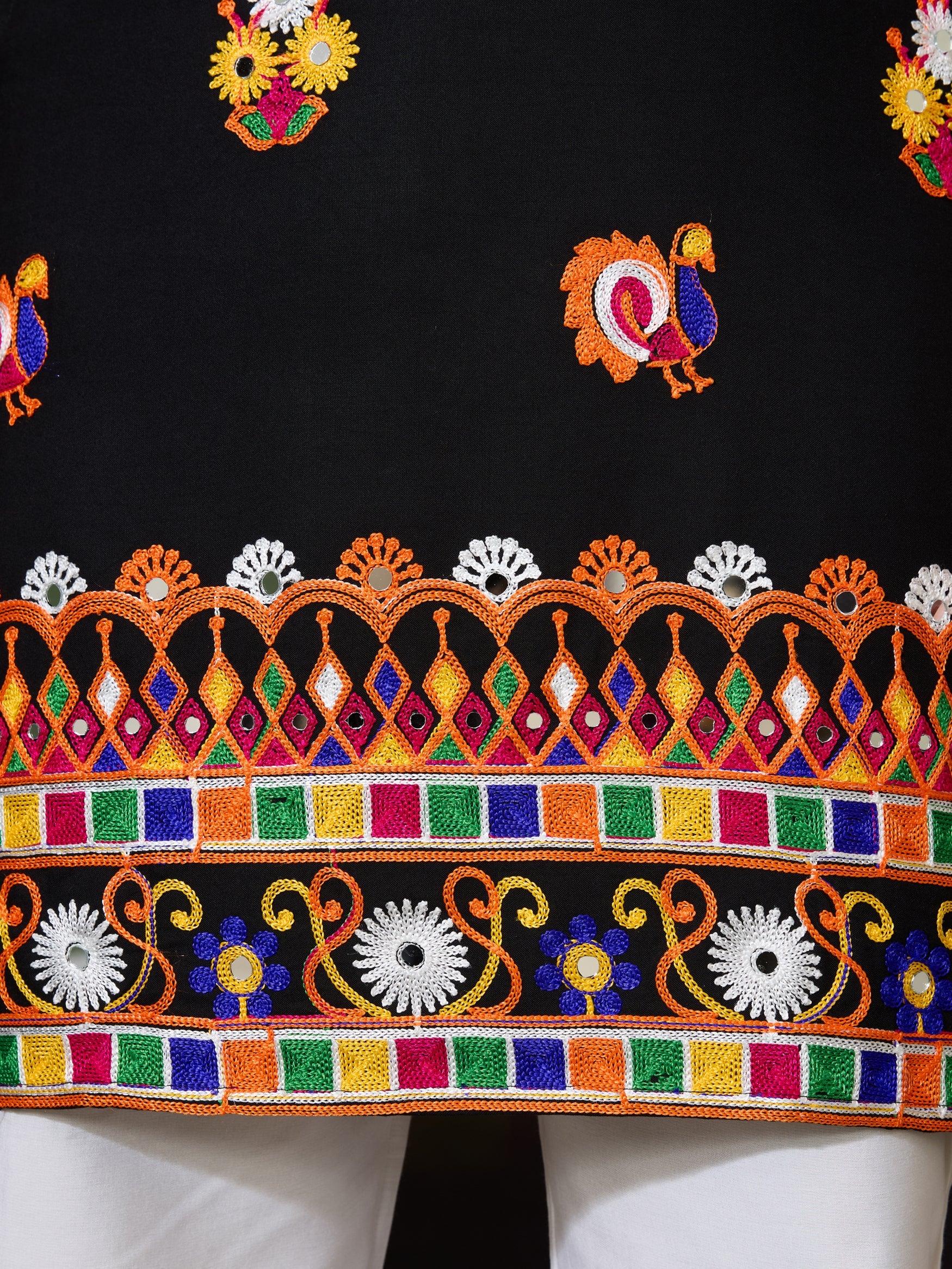 Step into celebration mode with this black cotton kurta, designed with exquisite multi-thread embroidery โจ and traditional mirror work ๐ฎ โ a stunning choice for Navratri nights ๐ช๐๐ถ.