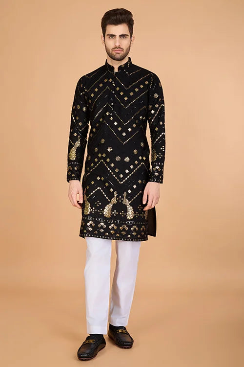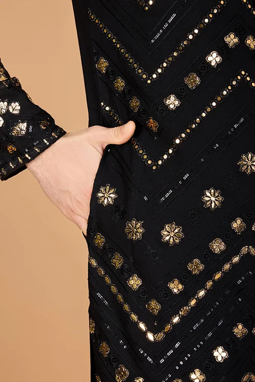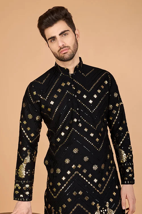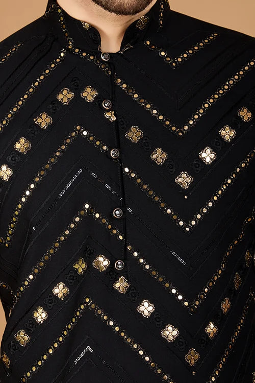 Made From High-quality Viscose Rayon, This Kurta is Soft, Breathable, and Comfortable for All-day Wear. The Thread and Sequence Black Men's Kurta Online Overpowering the Outfit, Making It Ideal for Multiple Occasions. The Fabric Drapes Well, Offering a Flattering Fit for Every Body Type.