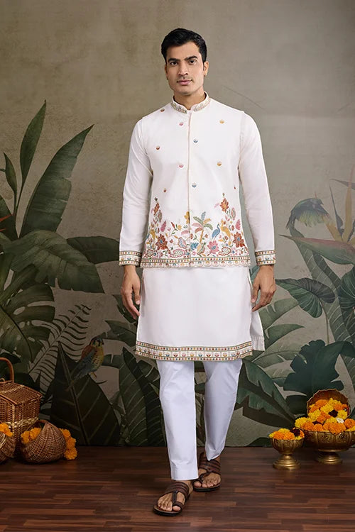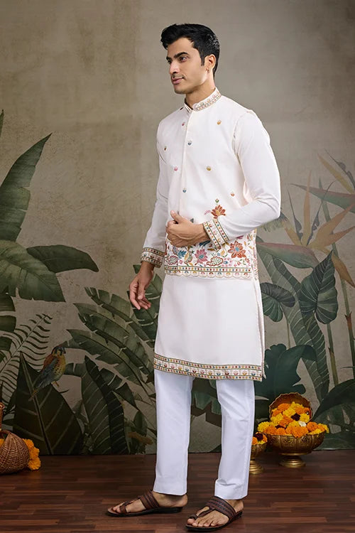 Whether You’re Attending a Wedding, a Festive Celebration, or a Cultural Event, This White Cotton Kurta with Jacket . This White Kurta Features Exquisite Thread and Sequence Embroidered Work, Adding a Touch of Regal Charm to Your Overall Look.