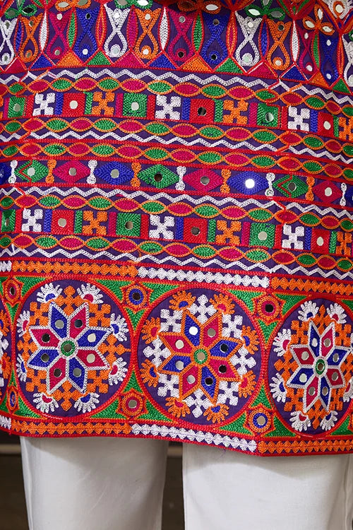 π« The multi-thread embroidery with real mirror work highlights craftsmanship and adds a sparkling festive appeal. Paired with a crisp white cotton bottom, it creates a balanced and graceful look for any celebration.