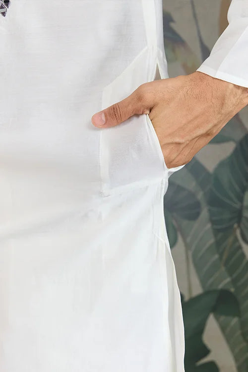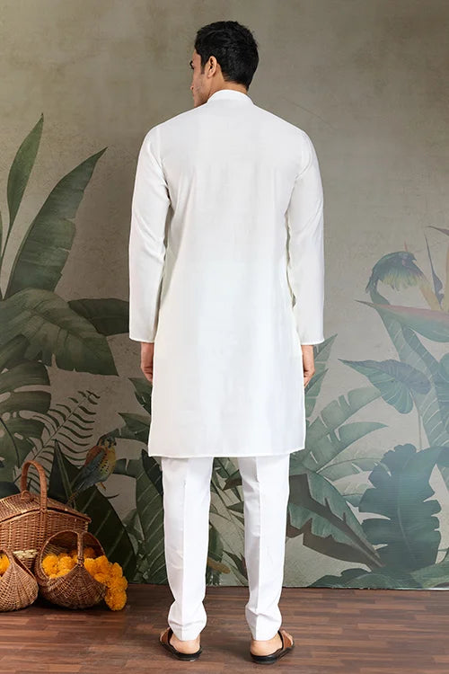 ๐ The White Pure Viscose Kurta is adorned with Mirror Work on Self-Jari Weaving Fabric, giving it a subtle festive shine and refined finish.