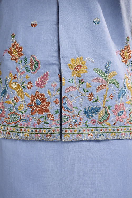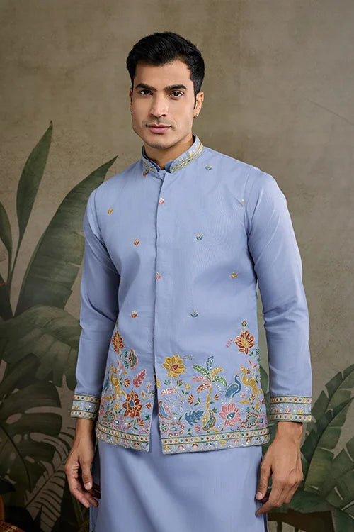 Looking for a Stylish and Sophisticated Ethnic Outfit? Our Sky Blue Men's Kurta Koti Set is the Perfect Blend of Tradition and Contemporary Fashion. With Exquisite Thread and Sequin Embroidered Work, Cotton Kurta and Jacket for Weddings, Festivals, and Special Occasions.