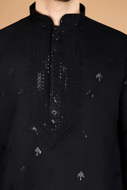 Crafted From Premium Viscose Silk Fabric, This Kurta Offers a Luxurious Feel and a Sophisticated Look. The Black Hue Adds a Timeless Charm, Making It Suitable for Various Occasions, From Events. The Stylish Black Kurta for Men Embellishments Enhance Its Men's Black Designer Kurta.
