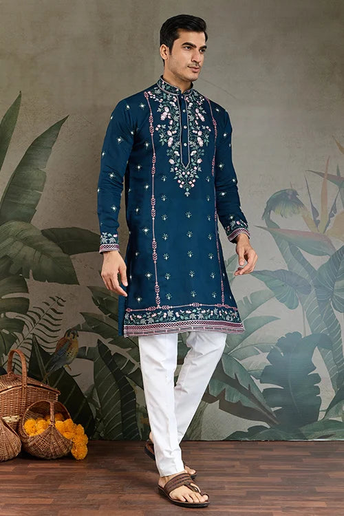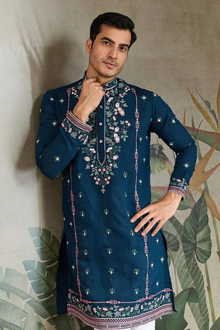 Teal Blue Embroidered Fancy Kurta for Men