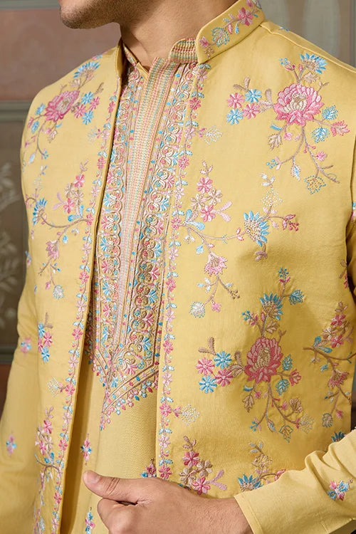 🌟 Crafted in premium viscose silk, this kurta offers a luxurious shine and comfortable fit, ideal for long pre-wedding celebrations. The vibrant yellow shade symbolizes positivity, happiness, and new beginnings—perfect for the Haldi function.