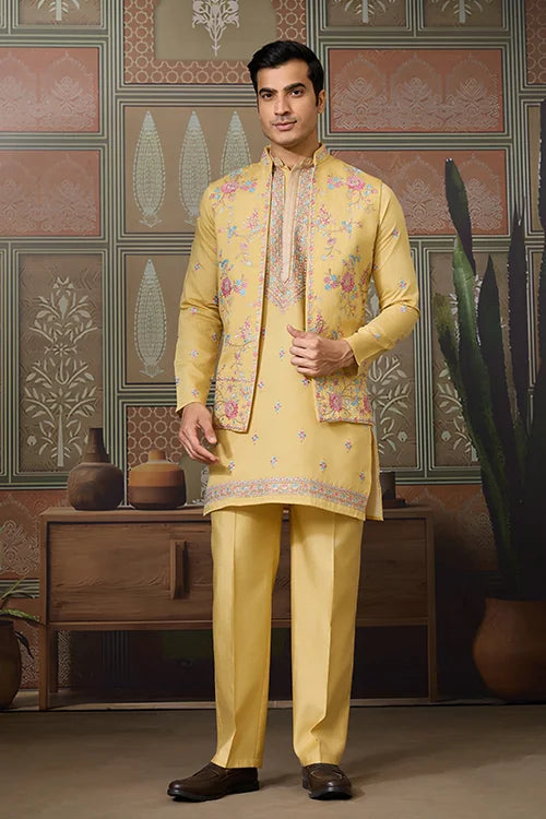💛 Trending Yellow Haldi Ceremony Koti Kurta for Men by Mahi Fab 💛
