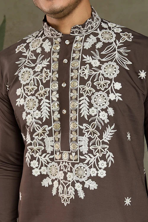 Make a Grand Impression With Our Chocolate Gray Embroidered Kurta, a Stunning Choice Designed for Modern Men Attending Wedding Functions and Festive Events. Crafted From Luxurious Viscose Silk, This Kurta Features Intricate Thread and Sequence Embroidered Work, Delivering the Perfect Blend of Elegance and Style