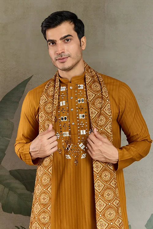 ๐ The Mustard Pure Viscose Kurta is richly detailed with Mirror Work on Self-Jari Weaving Fabric, giving it a radiant and festive charm.