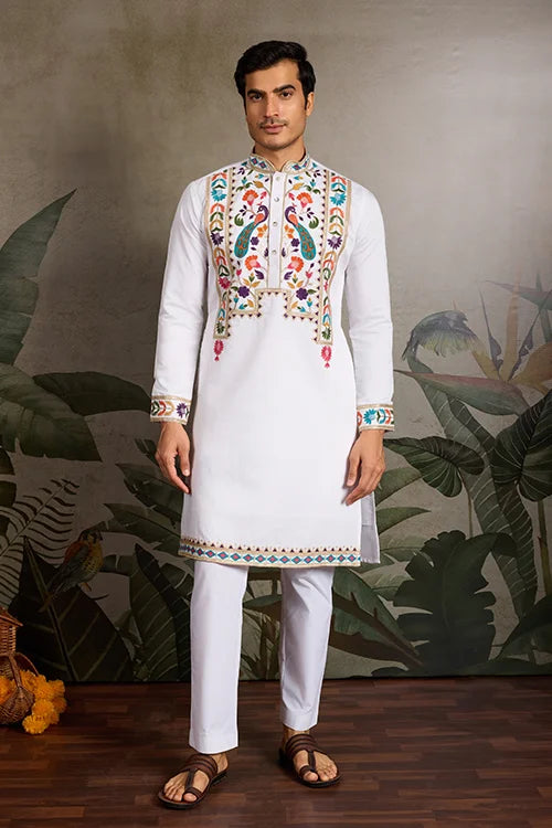 White Embroidered Mens Kurta for Special Events