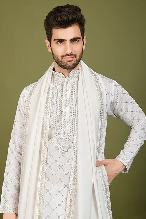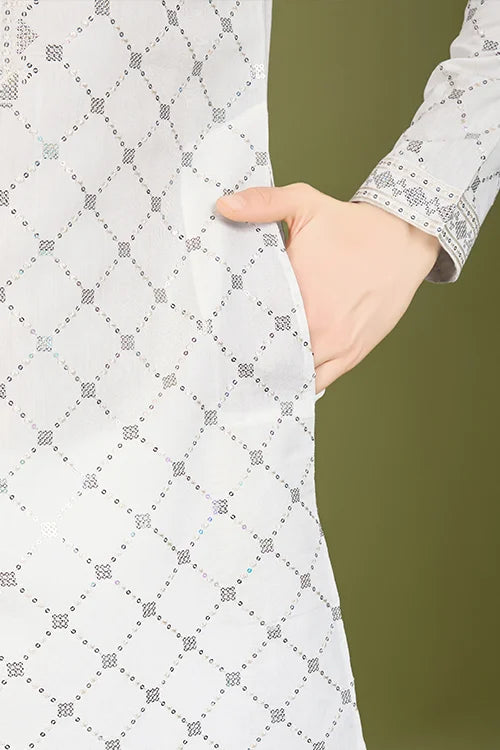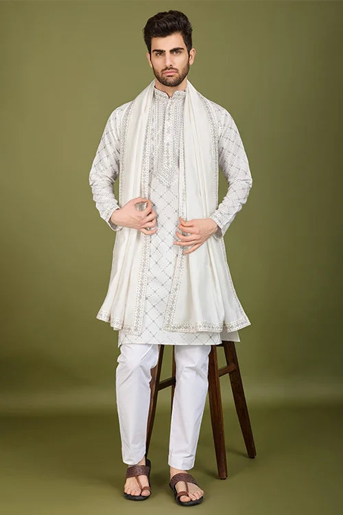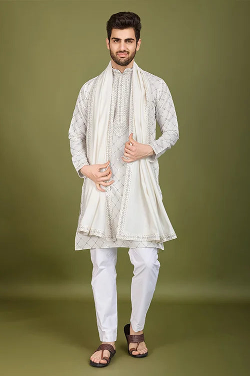 The Premium Fabric Ensures a Soft and Smooth Drape, Making It Comfortable to Wear for Long Hours. The Embroidery Detailing on the Kurta Adds a Refined Touch, Showcasing Fine Craftsmanship. The Beautiful Thread and Sequence Work Create a Subtle Shimmer, silk kurta white ethnic to Your Look.