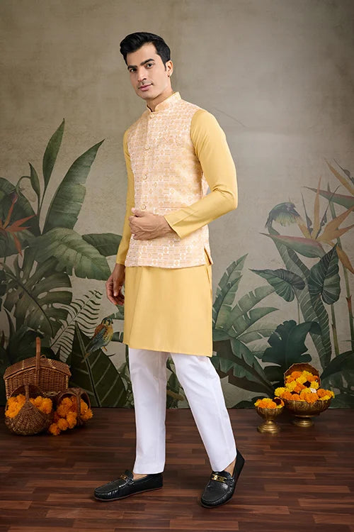 This Ensemble Seamlessly Blends Traditional Craftsmanship With Contemporary Design, and Cultural Celebrations. Investing in This Yellow Roman Silk Kurta With Wardrobe but Also Connects You With a Rich Heritage of Textile Artistry. Yellow Silk Kurta with Jacquard Jacket. Yellow Kurta with Jacquard Koti Jacket.